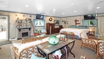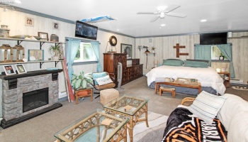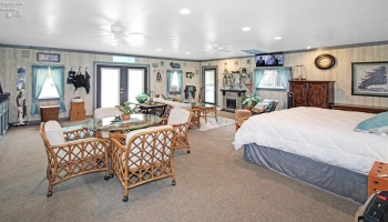 Discover this truly unique home filled with thoughtful extras and inviting spaces. Enjoy two fireplaces, including a striking stone accent wall with fireplace in the living room and floor-to-ceiling windows that flood the space with natural light. A spiral staircase leads from the primary bedroom to a private office in the basement, complemented by built-in bookshelves throughout.