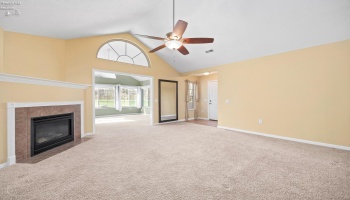 Discover lake-time luxury in this exquisite 3,018sqft home located in the gated community of Bar Harbor. This waterfront oasis features 5 elegant bedrooms & 5 baths, designed with meticulous detail throughout. The charming entry leads past a pocket office & opens into an inviting living area anchored by a striking floor to ceiling shiplap fireplace enhanced by 10-foot ceilings.